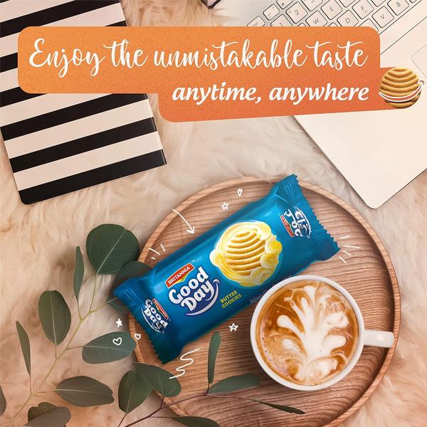 "Grab a Britannia Good Day cookie and sprinkle your day with a dose of optimism to make every little thing feel a whole lot better! Packed full of butter for a deliciously rich taste experience, our cookies are a wholesome and delectable snack bringing smiles to everyone’s face. Thanks to the abundance of flavorful ingredients and our unique recipe perfected for over a hundred years, this crunchy snack has an unmistakably buttery taste loved by generations. It is also trans-fat free for a healthier, but equally delicicious choice. Enjoy these crispy biscuits at home, on the go, with friends, or anyway you like! Loaded with nuts and butter, they make for a perfect office or school lunch box snack to fill your afternoon with smiles, as well as afternoon treat for some indulgent me-time after a long day. Pair them with a hot cup of coffee or tea for a sweet moment of joy or pack them for outdoor cookouts, winter picnics or weekend hikes and spread happiness to your loved ones and the whole world! Thanks to its conveniently sized portable pouch, Britannia Good Day cookies are easy to pack in a purse or backpack, so you can enjoy the irresistible taste anytime and anywhere you go to make every little moment special. Take a bite of goodness and make every day a good day with Britannia Good Day cookies!"