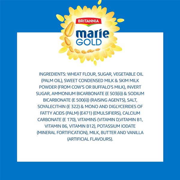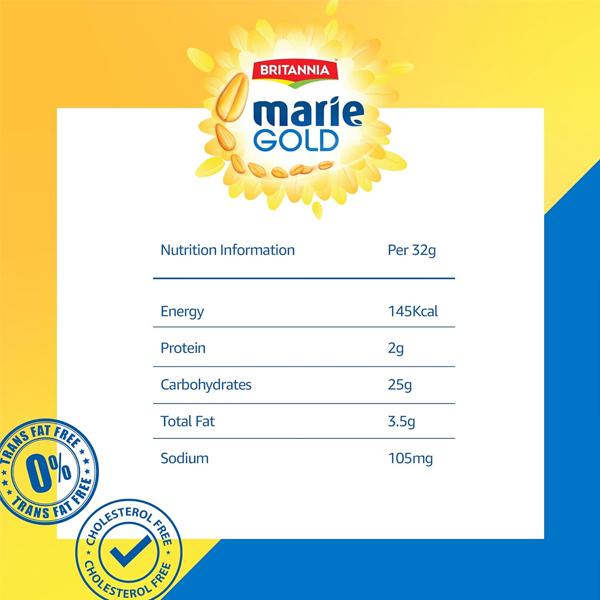 Britannia Marie Gold brings to you the classic light & crispy tea time biscuit in your favourite formats. Dunk it, Top it or Bake it, savour it your way! Britannia Industries is one of India’s leading food companies with a 100+ years baking legacy and a diverse portfolio of products in cakes, biscuits, bread and dairy categories. It is highly reputed for its superior ingredient curation, consistent quality over the years and uncompromising focus on taste. Today, Britannia's warmth has spread from its ovens to over 84 countries across the globe and is within your reach, just a click away!