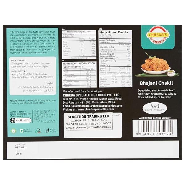 Savour the authentic flavour of Chheda’s Bhajni Chakli 200g, a traditional Indian snack loved for its crunchy texture and bold spices. Made from premium-quality flours and aromatic spices, this ready-to-eat snack is perfect for tea-time, festive occasions like Diwali, parties, or anytime you crave a savoury treat. Hygienically packed for freshness and convenience, Chheda’s Bhajni Chakli is a delicious and wholesome vegetarian snack that brings the taste of traditional Indian mithai to your home.