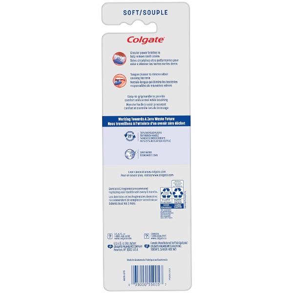 Brush your teeth with cleaning power using the Colgate Extra Clean Full Head Soft Adult Manual Toothbrush. This soft toothbrush is made with circular power bristles to help remove surface stains. Its cleaning tip features bristles that effectively clean teeth, while a tongue cleaner also helps clean mouth. With an easy-to-grip handle, this medium bristle toothbrush provides comfort and control while brushing.