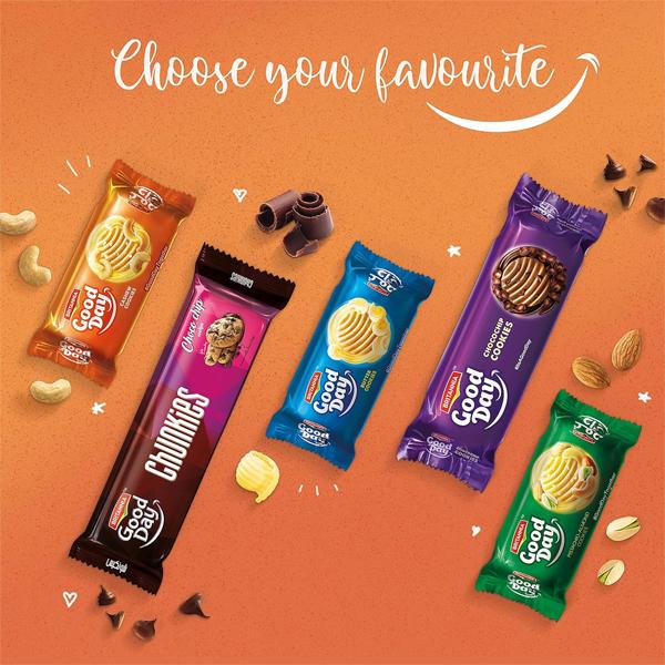 "Grab a Britannia Good Day cookie and sprinkle your day with a dose of optimism to make every little thing feel a whole lot better! Packed full of butter for a deliciously rich taste experience, our cookies are a wholesome and delectable snack bringing smiles to everyone’s face. Thanks to the abundance of flavorful ingredients and our unique recipe perfected for over a hundred years, this crunchy snack has an unmistakably buttery taste loved by generations. It is also trans-fat free for a healthier, but equally delicicious choice. Enjoy these crispy biscuits at home, on the go, with friends, or anyway you like! Loaded with nuts and butter, they make for a perfect office or school lunch box snack to fill your afternoon with smiles, as well as afternoon treat for some indulgent me-time after a long day. Pair them with a hot cup of coffee or tea for a sweet moment of joy or pack them for outdoor cookouts, winter picnics or weekend hikes and spread happiness to your loved ones and the whole world! Thanks to its conveniently sized portable pouch, Britannia Good Day cookies are easy to pack in a purse or backpack, so you can enjoy the irresistible taste anytime and anywhere you go to make every little moment special. Take a bite of goodness and make every day a good day with Britannia Good Day cookies!"