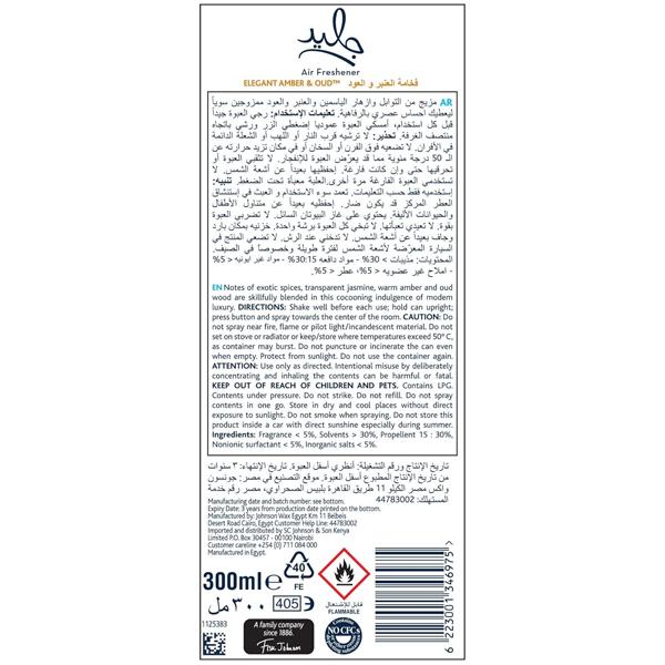 Indulge in the magnificence of classical luxury with Glade® Elegant Amber & Oud room freshener spray. The essence of exotic spices is blended with bergamot and violet leaves, and you’ll find the peacefully uplifting notes of warm amber, fresh jasmine, oud, vanilla beans and cedarwood. It’s earthy and exciting, yet peacefully uplifting and deeply relaxing. Designed to fight tough odours, and leave behind a warm exotic fragrance, Glade® air fresheners can be used on a daily basis or as the final touch after your cleaning routine. This fragrance spray instantly infuses the air with passionately crafted fragrances.