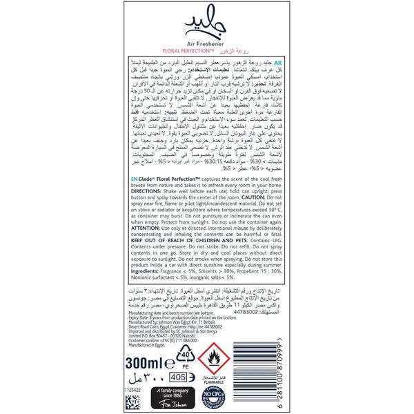 Eliminate odor and make your home inviting for all with Glade Floral Perfection room freshener spray. Notes of aromatic jasmine, hyacinth and rose join fresh greens to spark the lovely feeling of a surprise bouquet of freshly cut flowers. Designed to fight tough odours, Glade air fresheners can be used on a daily basis or as the final touch after your cleaning routine. This fragrance spray instantly infuses the air with passionately crafted fragrances.