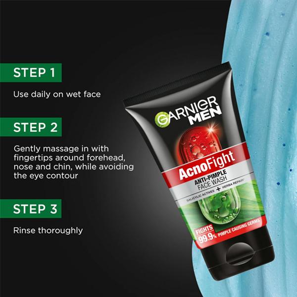 Reveal fresh, bright, and clear skin with the Garnier Men Acno Fight Face Wash. Germs and oil attack men’s skin and clog their pores, giving rise to acne and blackheads. The Acno Fight Facewash fights up to 99.9% of pimple causing germs to dry pimples, uproot blackheads, and give you skin that is clean and refreshed. Formulated with natural ingredients, the anti-acne face wash also helps control excess oil production and regenerates and repairs your skin to give you a healthy glow. The salicylic acid in the Garnier face wash for men neutralizes the bacteria and cleanses the skin while the micro-beads gently exfoliate the skin, unclog the pores, and remove blackheads.